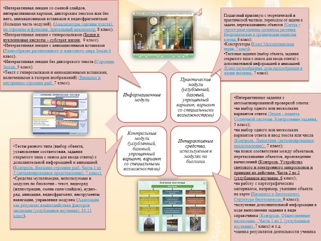 Средства мультимедиа, используемые в модулях по биологии - текст, видеоряд (иллюстрации, смена сцен/слайдов), аудио-ряд, анимация, видеофрагмент, инструменты навигации, управления модулем (Адаптации как результат взаимодействия факторов эволюции (углубленное изучение), 10-11 класс).