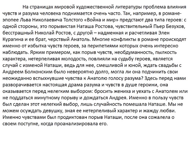 «В романе "Война и мир" Лев Николаевич Толстой пишет о человеческой сущности, которую определяют такие важные категории, как разум и чувство. Причём, и разум и чувство не должны категорично превалировать друг над другом. Иначе быть беде. Всё должно быть в меру. Хотя на примере Наташи Лев Толстой показывает, что человек, который живёт чувствами, ему ближе. Таких людей он называет прекрасными. И, чтобы человек в полной мере ощутил гармонию мира, разум ему просто мешает. Любимые герои Льва Николаевича Толстого без слов говорят о своём душевном состоянии. Они это выражают глазами, жестами, движениями».
