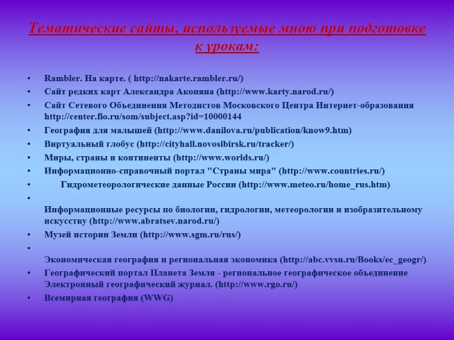 Rambler. На карте. ( http://nakarte.rambler.ru/) Сайт редких карт Александра Акопяна (http://www.karty.narod.ru/) Сайт Сетевого Объединения Методистов Московского Центра Интернет-образования http://center.fio.ru/som/subject.asp?id=10000144 География для малышей (http://www.danilova.ru/publication/know9.htm) Виртуальный глобус (http://cityhall.novosibirsk.ru/tracker/) Миры, страны и континенты (http://www.worlds.ru/) Информационно-справочный портал "Страны мира" (http://www.countries.ru/) Гидрометеорологические данные России (http://www.meteo.ru/home_rus.htm) Информационные ресурсы по биологии, гидрологии, метеорологии и изобразительному искусству (http://www.abratsev.narod.ru/) Музей истории Земли (http://www.sgm.ru/rus/) Экономическая география и региональная экономика (http://abc.vvsu.ru/Books/ec_geogr/) Географический портал Планета Земля - региональное географическое объединение Электронный географический журнал. (http://www.rgo.ru/) Всемирная география (WWG)