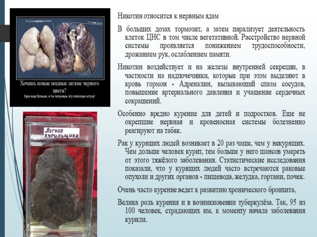 Никотин воздействует и на железы внутренней секреции, в частности на надпочечники, которые при этом выделяют в кровь гормон - Адреналин, вызывающий спазм сосудов, повышение артериального давления и учащение сердечных сокращений.