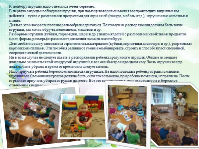 К подбору игрушек надо отнестись очень серьезно. В первую очередь необходимы игрушки, при помощи которых он может воспроизводить виденные им действия – кукла с различными предметами для игры с ней (посуда, мебель и т.д.), игрушечные животные и птицы. Детям в этом возрасте полезно разнообразно двигаться. Поэтому в их распоряжении должны быть такие игрушки, как мячи, обручи, велосипеды, машинки и др. Разборные игрушки (кубики, пирамидки, шары и др.) знакомят детей с различными свойствами предметов (цвет, форма, размеры) и развивают движения пальцев и кистей рук. Дети любят подолгу заниматься строительным материалом (кубики, кирпичики, цилиндры и др.), разрезными картинками-пазлами. Эти пособия развивают умение комбинировать, строить и способствуют спокойной, сосредоточенной деятельности. Ни в коем случае не следует давать в распоряжение ребенка сразу много игрушек. Обилие их мешает длительно заниматься той или другой игрушкой, и все они быстро надоедают ему. Часть игрушек всегда должна быть убрана, и время от времени их следует менять. Надо приучать ребенка бережно относиться к игрушкам. Не надо позволять ребенку играть ломаными игрушками. Сломанная игрушка должна быть, если это возможно, при ребенке починена, исправлена. После игры надо приучать убирать игрушки на место. Все это воспитывает у него аккуратность и бережное отношение к вещам.