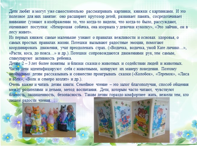 Дети любят и могут уже самостоятельно рассматривать картинки, книжки с картинками. И это полезное для них занятие: оно расширяет кругозор детей, развивает память, сосредотачивает внимание (узнают в изображении то, что когда-то видели, что когда-то было, рассуждают, оценивают поступки: «Нехорошая собачка, она изорвала у девочки куколку», «Это зайчик, он в лесу живет». Из первых книжек самые маленькие узнают о правилах вежливости и основах здоровья, о самых простых правилах жизни. Потешки вызывают радостные эмоции, помогают координировать движения, учат преодолевать страх. («Водичка, водичка, умой Кате личико…», «Расти, коса, до пояса…» и др.). Потешки сопровождаются движениями рук, тем самым, стимулируют активность ребенка. Детям 2 – 3 лет более понятны и близки сказки о животных и содействии людей и животных. Часто дети идентифицируют себя с животными, копируют их манеру поведения. Поэтому необходимо детям рассказывать и совместно проигрывать сказки («Колобок», «Теремок», «Лиса и волк», «Волк и семеро козлят» и др.). Очень важно и читать детям книги. Семейное чтение – это залог благополучия, способ общения между родителями и детьми, метод воспитания. Дети, которым часто читают, чувствуют близость, защищенность, безопасность. Таким детям гораздо комфортнее жить, нежели тем, кто лишен радости чтения.