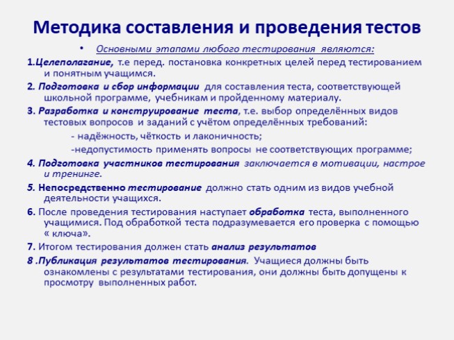 1.Целеполагание, т.е перед. постановка конкретных целей перед тестированием и понятным учащимся.