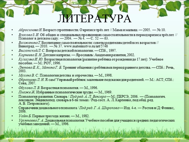 Власова З. И. Об общих и специальных проявлениях самостоятельности в период кризиса трёх лет // Психолог в детском саду. — 2004. — № 4. — С. 52 — 63.