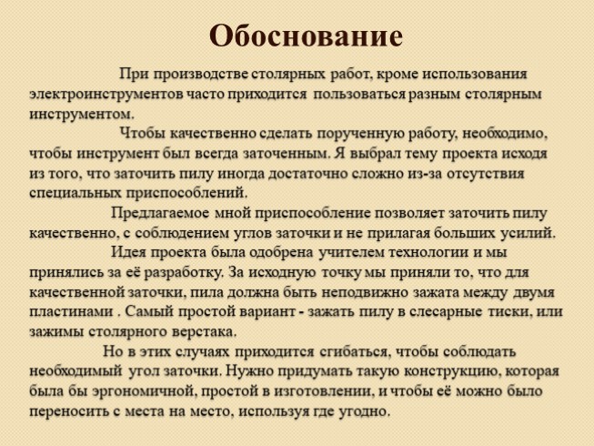 При производстве столярных работ, кроме использования электроинструментов часто приходится пользоваться разным столярным инструментом. Чтобы качественно сделать порученную работу, необходимо, чтобы инструмент был всегда заточенным. Я выбрал тему проекта исходя из того, что заточить пилу иногда достаточно сложно из-за отсутствия специальных приспособлений. Предлагаемое мной приспособление позволяет заточить пилу качественно, с соблюдением углов заточки и не прилагая больших усилий. Идея проекта была одобрена учителем технологии и мы принялись за её разработку. За исходную точку мы приняли то, что для качественной заточки, пила должна быть неподвижно зажата между двумя пластинами . Самый простой вариант - зажать пилу в слесарные тиски, или зажимы столярного верстака. Но в этих случаях приходится сгибаться, чтобы соблюдать необходимый угол заточки. Нужно придумать такую конструкцию, которая была бы эргономичной, простой в изготовлении, и чтобы её можно было переносить с места на место, используя где угодно.