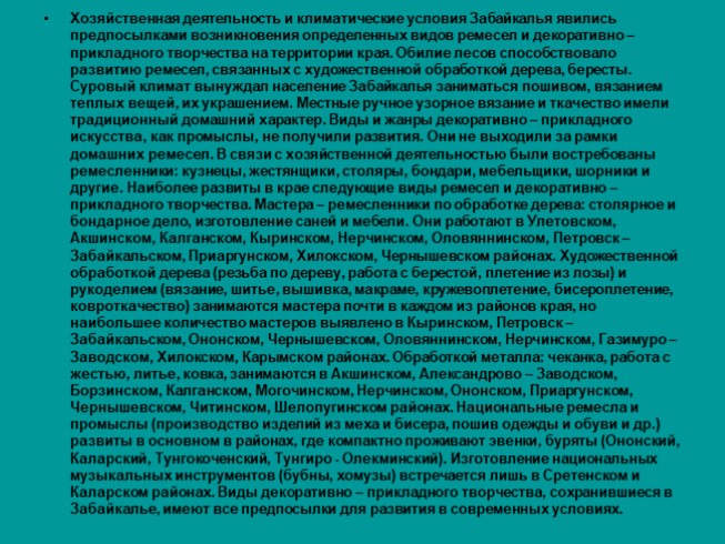 Хозяйственная деятельность и климатические условия Забайкалья явились предпосылками возникновения определенных видов ремесел и декоративно – прикладного творчества на территории края. Обилие лесов способствовало развитию ремесел, связанных с художественной обработкой дерева, бересты. Суровый климат вынуждал население Забайкалья заниматься пошивом, вязанием теплых вещей, их украшением. Местные ручное узорное вязание и ткачество имели традиционный домашний характер. Виды и жанры декоративно – прикладного искусства, как промыслы, не получили развития. Они не выходили за рамки домашних ремесел. В связи с хозяйственной деятельностью были востребованы ремесленники: кузнецы, жестянщики, столяры, бондари, мебельщики, шорники и другие. Наиболее развиты в крае следующие виды ремесел и декоративно – прикладного творчества. Мастера – ремесленники по обработке дерева: столярное и бондарное дело, изготовление саней и мебели. Они работают в Улетовском, Акшинском, Калганском, Кыринском, Нерчинском, Оловяннинском, Петровск – Забайкальском, Приаргунском, Хилокском, Чернышевском районах. Художественной обработкой дерева (резьба по дереву, работа с берестой, плетение из лозы) и рукоделием (вязание, шитье, вышивка, макраме, кружевоплетение, бисероплетение, ковроткачество) занимаются мастера почти в каждом из районов края, но наибольшее количество мастеров выявлено в Кыринском, Петровск – Забайкальском, Ононском, Чернышевском, Оловяннинском, Нерчинском, Газимуро – Заводском, Хилокском, Карымском районах. Обработкой металла: чеканка, работа с жестью, литье, ковка, занимаются в Акшинском, Александрово – Заводском, Борзинском, Калганском, Могочинском, Нерчинском, Ононском, Приаргунском, Чернышевском, Читинском, Шелопугинском районах. Национальные ремесла и промыслы (производство изделий из меха и бисера, пошив одежды и обуви и др.) развиты в основном в районах, где компактно проживают эвенки, буряты (Ононский, Каларский, Тунгокоченский, Тунгиро - Олекминский). Изготовление национальных музыкальных инструментов (бубны, хомузы) встречается лишь в Сретенском и Каларском районах. Виды декоративно – прикладного творчества, сохранившиеся в Забайкалье, имеют все предпосылки для развития в современных условиях.