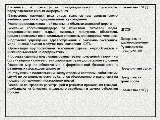 Организация непрерывной работы группы следователей МВД и ФСБ, дежурства сотрудников паспортного стола, справочной службы, электриков, сантехников и других специалистов коммунальных служб