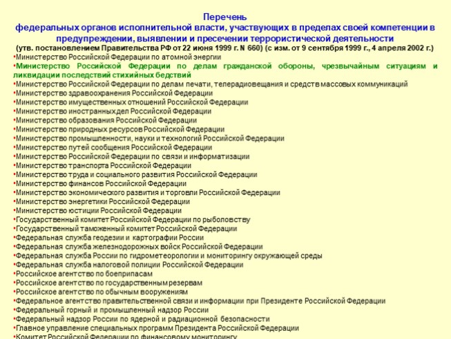 8. Постановление Правительства российской Федерации от 22.06.99 № 660 (ред. от 09.09.99) «Об утверждении перечня федеральных органов исполнительной власти, участвующих в пределах своей компетенции в предупреждении, выявлении и пресечении террористической деятельности».