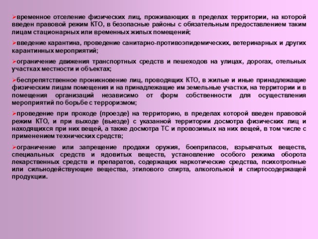 контртеррористическая операция – комплекс специальных, оперативно-боевых, войсковых и иных мероприятий с применением боевой техники, оружия и специальных средств по пресечению ТА, обезвреживанию террористов, обеспечению безопасности физических лиц, организаций и учреждений, а также по минимизации последствий ТА