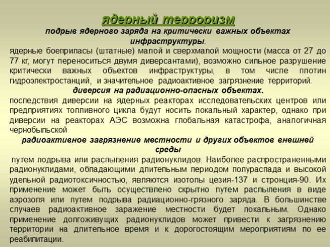 путем подрыва или распыления радионуклидов. Наиболее распространенными радионуклидами, обладающими длительным периодом полураспада и высокой удельной радиотоксичностью, являются изотопы цезия-137 и стронция-90. Их применение может быть осуществлено скрытно путем распыления в виде аэрозоля или путем подрыва радиационно-грязного заряда. В большинстве случаев радиоактивное заражение местности будет локальным. Однако применение долгоживущих радионуклидов может привести к загрязнению территории на длительное время и к дорогостоящим мероприятиям по ее реабилитации.