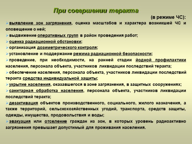проведение, при необходимости, на ранней стадии йодной профилактики населения, персонала объекта, участников ликвидации последствий теракта;
