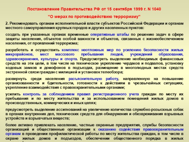 5. Постановление Правительства Российской Федерации от 15.09.99 № 1040 «О мерах по противодействию терроризму».