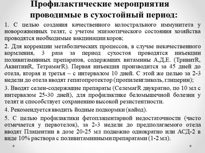 К сожалению общехозяйственные мероприятия не всегда позволяют добиться легких отёлов и тогда требуется применение лекарственных средств облегчающих отёл и профилактирующих задержание последа.