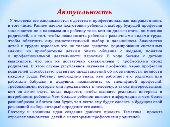 Поэтому и возникла идея создания данного проекта. Тематика проекта отражает знакомство детей с некоторыми профессиями родителей.