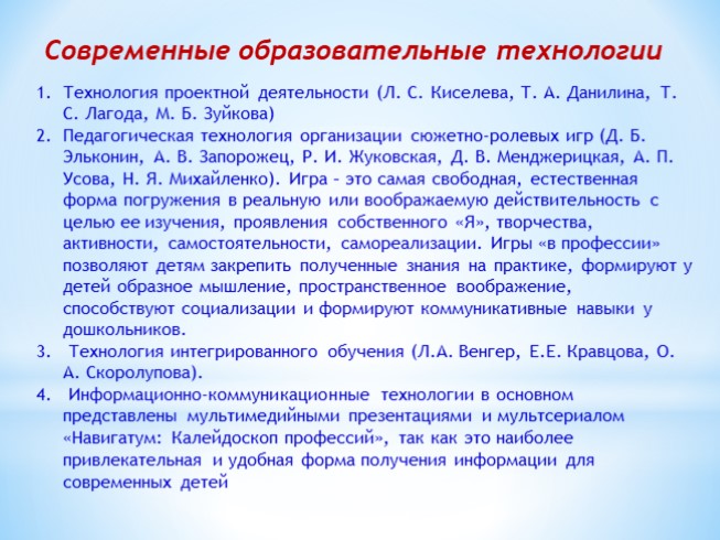 Педагогическая технология организации сюжетно-ролевых игр (Д. Б. Эльконин, А. В. Запорожец, Р. И. Жуковская, Д. В. Менджерицкая, А. П. Усова, Н. Я. Михайленко). Игра – это самая свободная, естественная форма погружения в реальную или воображаемую действительность с целью ее изучения, проявления собственного «Я», творчества, активности, самостоятельности, самореализации. Игры «в профессии» позволяют детям закрепить полученные знания на практике, формируют у детей образное мышление, пространственное воображение, способствуют социализации и формируют коммуникативные навыки у дошкольников.