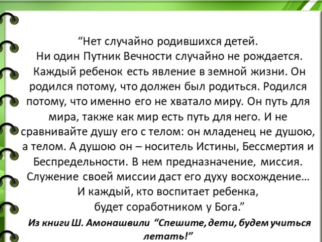 “Нет случайно родившихся детей. Ни один Путник Вечности случайно не рождается. Каждый ребенок есть явление в земной жизни. Он родился потому, что должен был родиться. Родился потому, что именно его не хватало миру. Он путь для мира, также как мир есть путь для него. И не сравнивайте душу его с телом: он младенец не душою, а телом. А душою он – носитель Истины, Бессмертия и Беспредельности. В нем предназначение, миссия. Служение своей миссии даст его духу восхождение… И каждый, кто воспитает ребенка, будет соработником у Бога.” Из книги Ш. Амонашвили “Спешите, дети, будем учиться летать!”