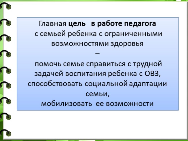 помочь семье справиться с трудной задачей воспитания ребенка с ОВЗ, способствовать социальной адаптации семьи,