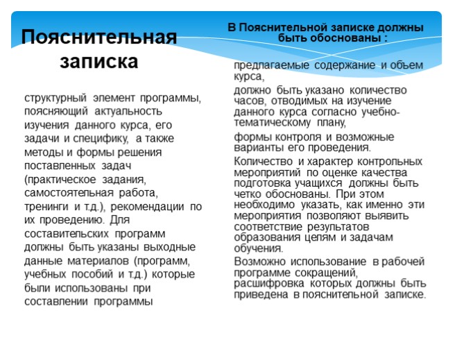 структурный элемент программы, поясняющий актуальность изучения данного курса, его задачи и специфику, а также методы и формы решения поставленных задач (практическое задания, самостоятельная работа, тренинги и т.д.), рекомендации по их проведению. Для составительских программ должны быть указаны выходные данные материалов (программ, учебных пособий и т.д.) которые были использованы при составлении программы