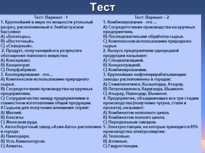1. Крупнейший в мире по мощности угольный разрез, расположенный в Экибастузском бассейне: A) «Богатырь». B) «Восточный». C) «Северный». 2. Продукт, получающийся в результате обогащения полезного вещества: A) Консервант. B) Концентрат. C) Полуфабрикат. 3. Кооперирование - это... A) Комплексное использование природного сырья. B) Сосредоточение производства на крупных предприятиях. C) Сотрудничество между предприятиями в совместном изготовлении общей продукции. 4 Сырьем для получения алюминия служат: A) Магний. B) Бокситы C) Железная руда. 5. Автосборочный завод «Азия-Авто» расположен в городе: A) Павлодаре. B) Усть-Каменогорске. C) Алматы. Тест: Вариант – 2