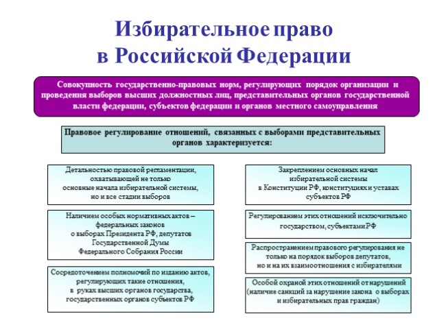 Совокупность государственно-правовых норм, регулирующих порядок организации и проведения выборов высших должностных лиц, представительных органов государственной власти федерации, субъектов федерации и органов местного самоуправления