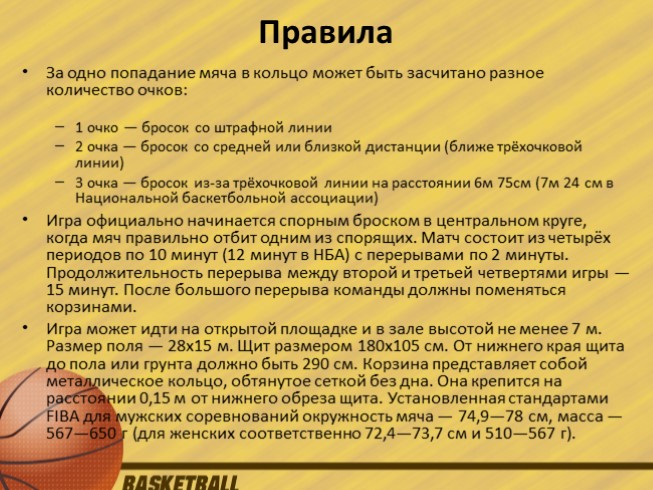 Всего в команде 12 человек, замены не ограничены. За мяч, заброшенный с ближней и средней дистанции, засчитывается 2 очка, с дальней — 3 очка. Штрафной бросок оценивается в 1 очко. Стандартный размер баскетбольной площадки 28 метров в длину и 15 метров в ширину.