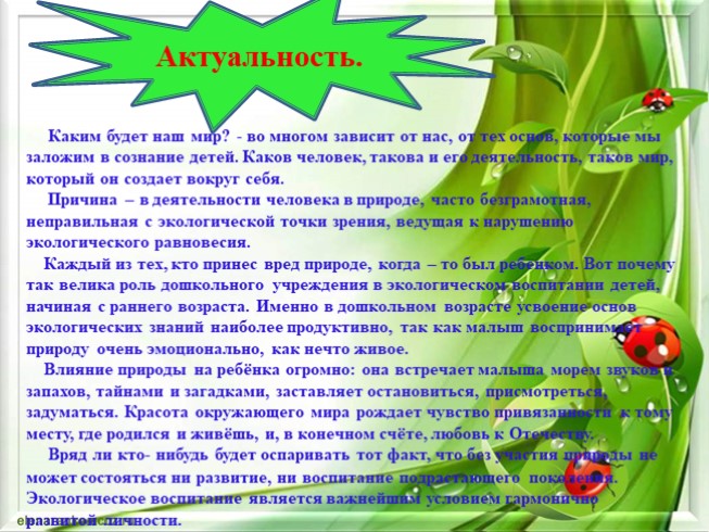 Вряд ли кто- нибудь будет оспаривать тот факт, что без участия природы не может состояться ни развитие, ни воспитание подрастающего поколения. Экологическое воспитание является важнейшим условием гармонично развитой личности.