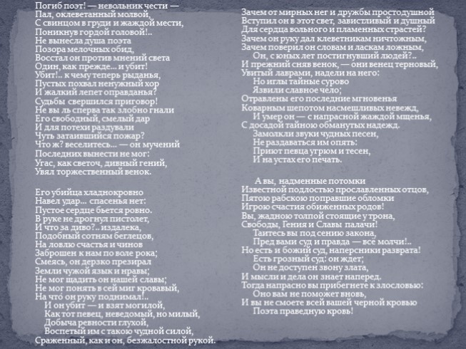 Погиб поэт! — невольник чести — Пал, оклеветанный молвой, С свинцом в груди и жаждой мести, Поникнув гордой головой!.. Не вынесла душа поэта Позора мелочных обид, Восстал он против мнений света Один, как прежде... и убит! Убит!.. к чему теперь рыданья, Пустых похвал ненужный хор И жалкий лепет оправданья? Судьбы свершился приговор! Не вы ль сперва так злобно гнали Его свободный, смелый дар И для потехи раздували Чуть затаившийся пожар? Что ж? веселитесь... — он мучений Последних вынести не мог: Угас, как светоч, дивный гений, Увял торжественный венок.