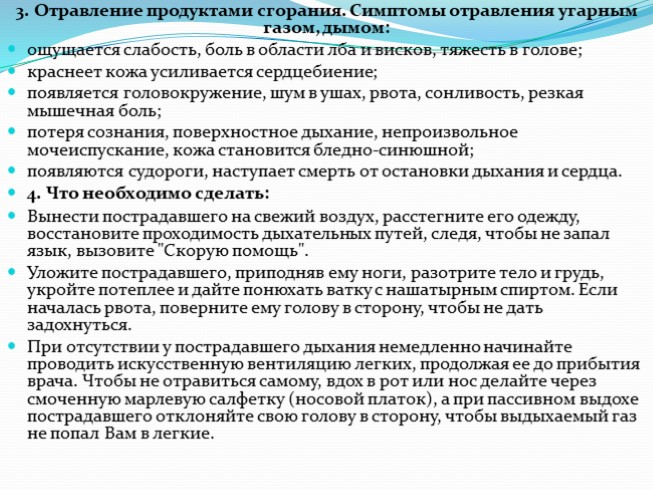 3. Отравление продуктами сгорания. Симптомы отравления угарным газом, дымом:
