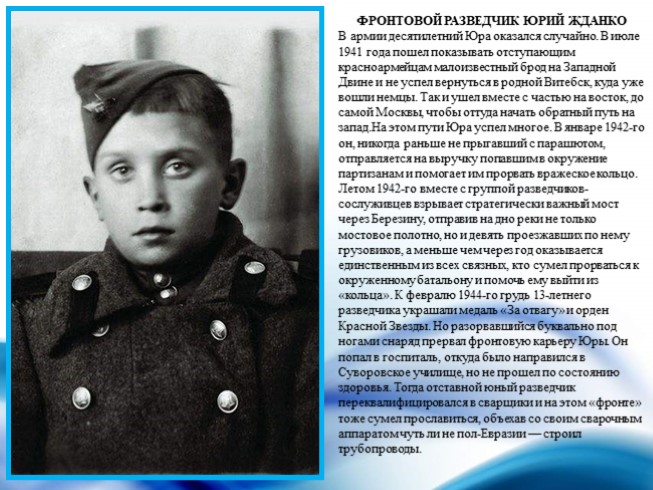 В армии десятилетний Юра оказался случайно. В июле 1941 года пошел показывать отступающим красноармейцам малоизвестный брод на Западной Двине и не успел вернуться в родной Витебск, куда уже вошли немцы. Так и ушел вместе с частью на восток, до самой Москвы, чтобы оттуда начать обратный путь на запад.На этом пути Юра успел многое. В январе 1942-го он, никогда раньше не прыгавший с парашютом, отправляется на выручку попавшим в окружение партизанам и помогает им прорвать вражеское кольцо. Летом 1942-го вместе с группой разведчиков-сослуживцев взрывает стратегически важный мост через Березину, отправив на дно реки не только мостовое полотно, но и девять проезжавших по нему грузовиков, а меньше чем через год оказывается единственным из всех связных, кто сумел прорваться к окруженному батальону и помочь ему выйти из «кольца». К февралю 1944-го грудь 13-летнего разведчика украшали медаль «За отвагу» и орден Красной Звезды. Но разорвавшийся буквально под ногами снаряд прервал фронтовую карьеру Юры. Он попал в госпиталь, откуда было направился в Суворовское училище, но не прошел по состоянию здоровья. Тогда отставной юный разведчик переквалифицировался в сварщики и на этом «фронте» тоже сумел прославиться, объехав со своим сварочным аппаратом чуть ли не пол-Евразии — строил трубопроводы.