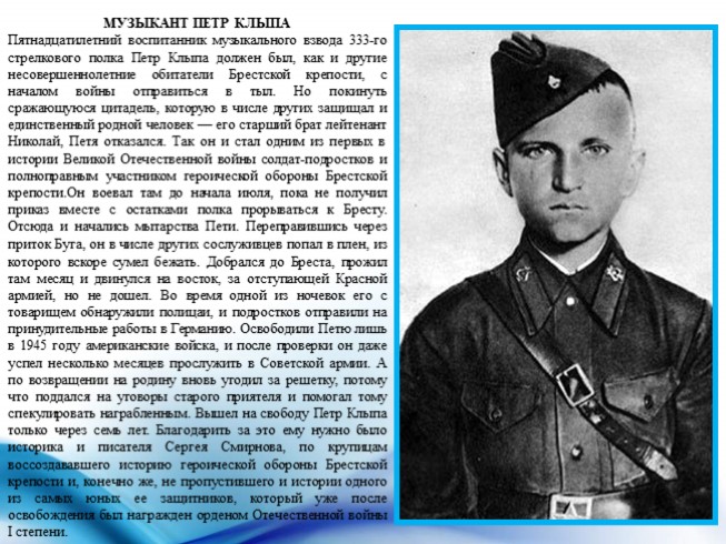 Пятнадцатилетний воспитанник музыкального взвода 333-го стрелкового полка Петр Клыпа должен был, как и другие несовершеннолетние обитатели Брестской крепости, с началом войны отправиться в тыл. Но покинуть сражающуюся цитадель, которую в числе других защищал и единственный родной человек — его старший брат лейтенант Николай, Петя отказался. Так он и стал одним из первых в истории Великой Отечественной войны солдат-подростков и полноправным участником героической обороны Брестской крепости.Он воевал там до начала июля, пока не получил приказ вместе с остатками полка прорываться к Бресту. Отсюда и начались мытарства Пети. Переправившись через приток Буга, он в числе других сослуживцев попал в плен, из которого вскоре сумел бежать. Добрался до Бреста, прожил там месяц и двинулся на восток, за отступающей Красной армией, но не дошел. Во время одной из ночевок его с товарищем обнаружили полицаи, и подростков отправили на принудительные работы в Германию. Освободили Петю лишь в 1945 году американские войска, и после проверки он даже успел несколько месяцев прослужить в Советской армии. А по возвращении на родину вновь угодил за решетку, потому что поддался на уговоры старого приятеля и помогал тому спекулировать награбленным. Вышел на свободу Петр Клыпа только через семь лет. Благодарить за это ему нужно было историка и писателя Сергея Смирнова, по крупицам воссоздававшего историю героической обороны Брестской крепости и, конечно же, не пропустившего и истории одного из самых юных ее защитников, который уже после освобождения был награжден орденом Отечественной войны I степени.