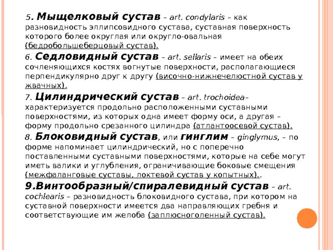 5. Мыщелковый сустав art. condylaris как разновидность эллипсовидного сустава, суставная поверхность которого более округлая или округло-овальная (бедробольшеберцовый сустав). 6. Седловидный сустав art. sellaris имеет на обеих сочленяющихся костях вогнутые поверхности, располагающиеся перпендикулярно друг к другу (височно-нижнечелюстной сустав у жвачных). 7. Цилиндрический сустав art. trochoidea характеризуется продольно расположенными суставными поверхностями, из которых одна имеет форму оси, а другая форму продольно срезанного цилиндра (атлантоосевой сустав). 8. Блоковидный сустав, или гинглим ginglymus, по форме напоминает цилиндрический, но с поперечно поставленными суставными поверхностями, которые на себе могут иметь валики и углубления, ограничивающие боковые смещения (межфаланговые суставы, локтевой сустав у копытных).. 9. Винтообразный спиралевидный сустав art. cochlearis разновидность блоковидного сустава, при котором на суставной поверхности имеется два направляющих гребня и соответствующие им желоба (заплюсноголенный сустав).