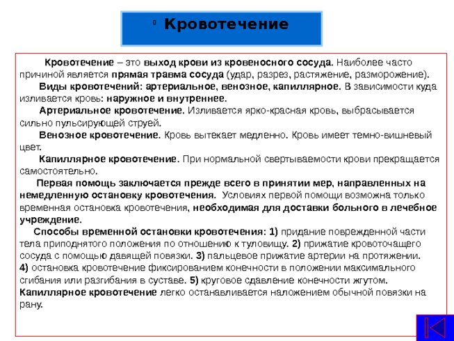 Кровотечение – это выход крови из кровеносного сосуда . Наиболее часто причиной является прямая травма сосуда (удар, разрез, растяжение, разморожение).