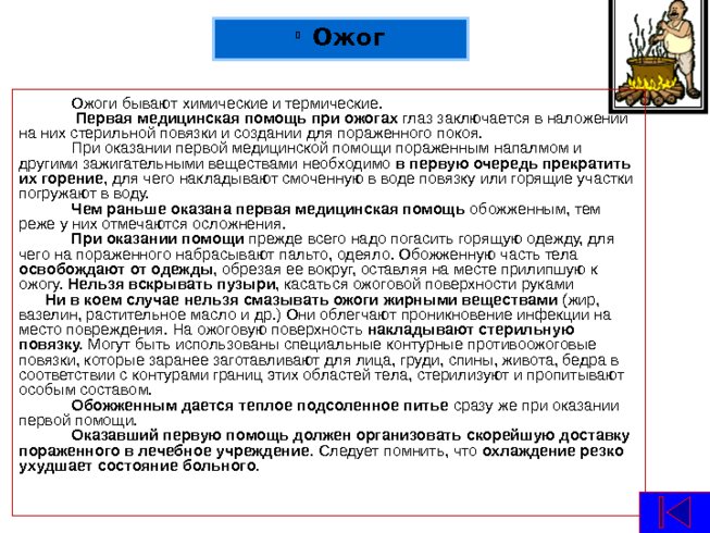 Ожоги бывают химические и термические. Первая медицинская помощь при ожогах глаз заключается в наложении на них стерильной повязки и создании для пораженного покоя. При оказании первой медицинской помощи пораженным напалмом и другими зажигательными веществами необходимо в первую очередь прекратить их горение , для чего накладывают смоченную в воде повязку или горящие участки погружают в воду. Чем раньше оказана первая медицинская помощь обожженным, тем реже у них отмечаются осложнения. При оказании помощи прежде всего надо погасить горящую одежду, для чего на пораженного набрасывают пальто, одеяло. Обожженную часть тела освобождают от одежды , обрезая ее вокруг, оставляя на месте прилипшую к ожогу. Нельзя вскрывать пузыри , касаться ожоговой поверхности руками Ни в коем случае нельзя смазывать ожоги жирными веществами (жир, вазелин, растительное масло и др.) Они облегчают проникновение инфекции на место повреждения. На ожоговую поверхность накладывают стерильную повязку. Могут быть использованы специальные контурные противоожоговые повязки, которые заранее заготавливают для лица, груди, спины, живота, бедра в соответствии с контурами границ этих областей тела, стерилизуют и пропитывают особым составом. Обожженным дается теплое подсоленное питье сразу же при оказании первой помощи. Оказавший первую помощь должен организовать скорейшую доставку пораженного в лечебное учреждение. Следует помнить, что охлаждение резко ухудшает состояние больного. Ожог