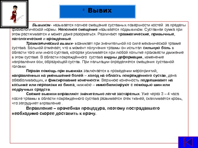 Вывихом - называется полное смещение суставных поверхности костей за пределы физиологической нормы. Неполное смещение называется подвывихом. Суставная сумка при этом растягивается и может даже разорваться. Различают травматические , привычные , патологические и врожденные . Травматический вывих- возникает при значительной по силе механической травме сустава. Больной отмечает, что в момент получения травмы он испытал сильную боль в области того или иного сустава, которая усиливается при любой попытке произвести движение в этом суставе. В области повреждённого сустава видны деформация , изменение направления оси, образующей сустав. При пальпации определяется смещения суставной головки. Первая помощь при вывихах заключается в проведении мероприятий, направленных на уменьшение болей – холод на область поврежденного сустав , дача обезболивающих, и фиксирование конечности . Верхнюю конечность подвешивают на косынке или перевязки из бинта , нижнюю – иммобилизируют с помощью шин или подручных средств . Свежие вывихи вправляют значительно легче застарелых . Уже через 3 – 4 часа после травмы в области поврежденного сустава развивается отек тканей, скапливается кровь, что затрудняет вправление . Вправление – врачебная процедура, поэтому пострадавшего необходимо скорее доставить к врачу. Вывих
