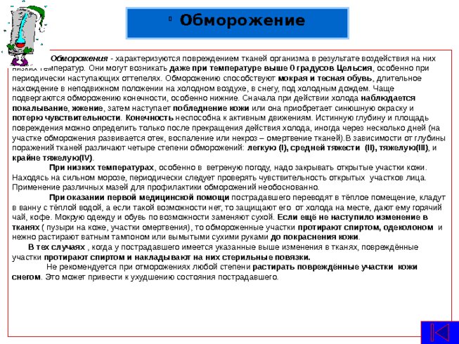 Обморожения - характеризуются повреждением тканей организма в результате воздействия на них низких температур. Они могут возникать даже при температуре выше 0 градусов Цельсия , особенно при периодически наступающих оттепелях. Обморожению способствуют мокрая и тесная обувь , длительное нахождение в неподвижном положении на холодном воздухе, в снегу, под холодным дождем. Чаще подвергаются обморожению конечности, особенно нижние. Сначала при действии холода наблюдается покалывание , жжение , затем наступает побледнение кожи или она приобретает синюшную окраску и потерю чувствительности . Конечность неспособна к активным движениям. Истинную глубину и площадь повреждения можно определить только после прекращения действия холода, иногда через несколько дней (на участке обморожения развивается отек, воспаление или некроз – омертвение тканей). В зависимости от глубины поражений тканей различают четыре степени обморожений: легкую ( I ), средней тяжести ( II) , тяжелую( III) , и крайне тяжелую( IV) . При низких температурах , особенно в ветреную погоду, надо закрывать открытые участки кожи. Находясь на сильном морозе, периодически следует проверять чувствительность открытых участков лица. Применение различных мазей для профилактики обморожений необоснованно. При оказании первой медицинской помощи пострадавшего переводят в тёплое помещение, кладут в ванну с тёплой водой, а если такой возможности нет, то защищают его от холода на месте, дают ему горячий чай, кофе. Мокрую одежду и обувь по возможности заменяют сухой. Если ещё не наступило изменение в тканях ( пузыри на коже, участки омертвения), то обмороженные участки протирают спиртом, одеколоном и нежно растирают ватным тампоном или вымытыми сухими руками до покраснения кожи . В тех случаях , когда у пострадавшего имеется указанные выше изменения в тканях, повреждённые участки протирают спиртом и накладывают на них стерильные повязки. Не рекомендуется при отморожениях любой степени растирать повреждённые участки кожи снегом . Это может привести к ухудшению состояния пострадавшего. Обморожение