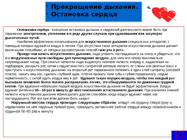 Остановка сердца - внезапная остановка дыхания и сердечной деятельности может быть при поражении электротоком, утоплении и в ряде других случаев при сдавливании или закупорке дыхательных путей. Наиболее эффективно использование для искусственного дыхания специальных аппаратов, с помощью которых вдувается воздух в легкие. При отсутствии таких аппаратов искусственное дыхание делают различными способами, из которых распространен способ «изо рта в рот». Прежде чем начать искусственное дыхание , надо уложить пострадавшего на спину и убедиться, что его воздухоносные пути свободны для прохождения воздуха , для чего его голову максимально запрокидывают назад. При сжатых челюстях надо выдвинуть нижнюю челюсть вперед и, надавливая на подбородок, раскрыть рот, затем следует очистить салфеткой ротовую полость от слюны или рвотных масс и приступить к искусственному дыханию: на открытый рот пораженного положить в один слой салфетку (носовой платок), зажать ему нос, сделать глубокий вдох, плотно прижать свои губы к губам пораженного, создав герметичность, с силой вдуть воздух ему в рот. Вдувают такую порцию воздуха, чтобы она каждый раз вызывала возможно более полное расправление легких, это обнаруживается по движению грудной клетки. При вдувании небольших порций воздуха искусственное дыхание не будет эффективным. Воздух вдувают ритмично 16—18 раз в минуту до восстановления естественного дыхания . При ранениях нижней челюсти искусственное дыхание можно делать другим способом, когда воздух вдувают через нос пострадавшего. Рот его при этом должен быть закрыт. Наружный массаж сердца проводят следующим образом : кладут на грудину левую руку и, надавливая на нее ладонью правой руки, проводить ритмичное сжатие сердца между позвоночником и грудиной 50-60 раз в минуту. Прекращение дыхания. Остановка сердца