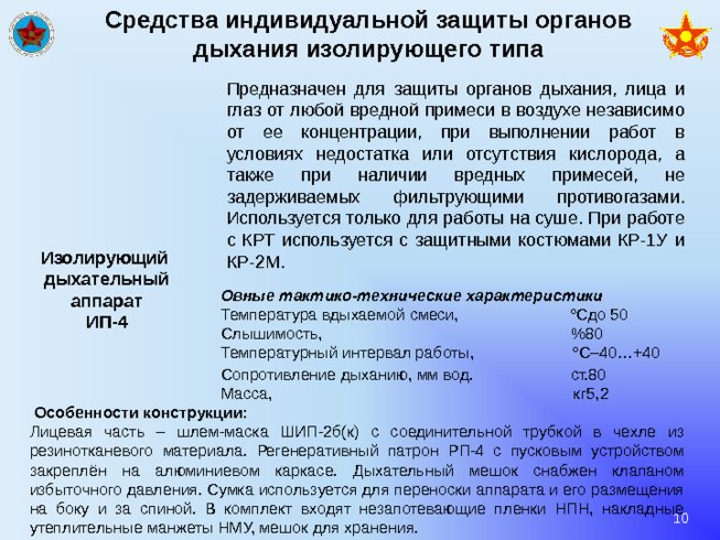 Средства индивидуальной защиты органов дыхания изолирующего типа Изолирующий дыхательный аппарат ИП-4 Предназначен для защиты органов дыхания, лица и глаз от любой вредной примеси в воздухе независимо от ее концентрации, при выполнении работ в условиях недостатка или отсутствия кислорода, а также при наличии вредных примесей, не задерживаемых фильтрующими противогазами. Используется только для работы на суше. При работе с КРТ используется с защитными костюмами КР-1У и КР-2М. Овные тактико-технические характеристики Температура вдыхаемой смеси, Сдо 50 Слышимость, %80 Температурный интервал работы, С–40 40 Сопротивление дыханию, мм вод. ст.80 Масса, кг5,2 Особенности конструкции: Лицевая часть – шлем-маска ШИП-2б(к) с соединительной трубкой в чехле из резинотканевого материала. Регенеративный патрон РП-4 с пусковым устройством закреплён на алюминиевом каркасе. Дыхательный мешок снабжен клапаном избыточного давления. Сумка используется для переноски аппарата и его размещения на боку и за спиной. В комплект входят незапотевающие пленки НПН, накладные утеплительные манжеты НМУ, мешок для хранения.