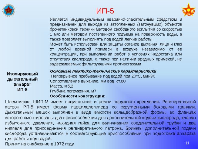 Изолирующий дыхательный аппарат ИП-5 Является индивидуальным аварийно-спасательным средством и предназначен для выхода из затопленных (затонувших) объектов бронетанковой техники методом свободного всплытия со скоростью 1 м/с или методом постепенного подъема на поверхность воды, а также позволяет выполнять под водой легкие работы. Может быть использован для защиты органов дыхания, лица и глаз от любой вредной примеси в воздухе независимо от ее концентрации, при выполнении работ в условиях недостатка или отсутствия кислорода, а также при наличии вредных примесей, не задерживаемых фильтрующими противогазами. Основные тактико-технические характеристики Непрерывное пребывание под водой при 20 С, мин90 Сопротивление дыханию, мм вод. ст.80 Масса, кг5,2 Глубина погружения, м7 Особенности конструкции: Шлем-маска ШИП-М имеет подмасочник и ремни наружного крепления. Регенеративный патрон РП-5 имеет форму параллелепипеда со скругленными боковыми гранями. Дыхательный мешок выполнен в виде емкости кольцеобразной формы, во фланцах которого смонтированы два приспособления для дополнительной подачи кислорода, клапан избыточного давления, накидная гайка для ввинчивания соединительной трубки и два ниппеля для присоединения регенеративного патрона. Брикеты дополнительной подачи кислорода устанавливаются в соответствующие приспособления при подготовке аппарата для работы под водой. Принят на снабжение в 1972 году. ИП-5