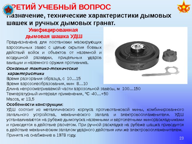Унифицированная дымовая шашка УДШ Предназначена для постановки маскирующих аэрозольных завес с целью скрытия боевых действий войск и объектов от наземной и воздушной разведки, прицельных ударов авиации и наземного оружия противника . Основные тактико-технические характеристики Время разгорания образца, с 10 15 Время аэрозолеобразования, мин 8 10 Длина непросматриваемой части аэрозольной завесы, м 100 150 Температурный интервал применения, С -40 50 Масса, кг 13,5 Особенности конструкции: УДШ состоит из металлического корпуса противотанковой мины, комбинированного запального устройства, механического запала и электровоспламенителя. УДШ устанавливаются на рубеже дымопуска наземными и вертолетными минораскладчиками и приводятся в действие расчетом. При ручной раскладке на рубеже шашка приводится в действие механическим запалом ударного действия или же электровоспламенителем. Принята на снабжение в 1978 году.
