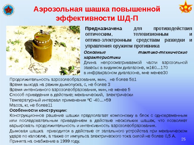 Аэрозольная шашка повышенной эффективности ШД-П Предназначена для противодействия оптическим, телевизионным и оптико-электронным средствам разведки и управления оружием противника Основные тактико-технические характеристики Длина непросматриваемой части аэрозольной завесы: в видимом диапазоне, м160 170 в инфракрасном диапазоне, мне менее30 Продолжительность азрозолеобразования, мин, не более 5 1 Время выхода на режим дымопуска, с, не более 3 Время интенсивного аэрозолеобразования, мин, не менее 5 Способ приведения в действие; механический, электрически Температурный интервал применения 0 С -40 59 Масса, кг, не более11 Особенности конструкции: Конструкционное решение шашки предполагает компоновку в блок с одновременным или последовательным приведением в действие нескольких шашек, что позволяет варьировать продолжительность и интенсивность аэрозолеобразования. Дымовая шашка приводится в действие от запального устройства при механическом ударе по капсюлю, а также от импульса электрического тока силой не более 0,5 А. Принята на снабжение в 1999 году.