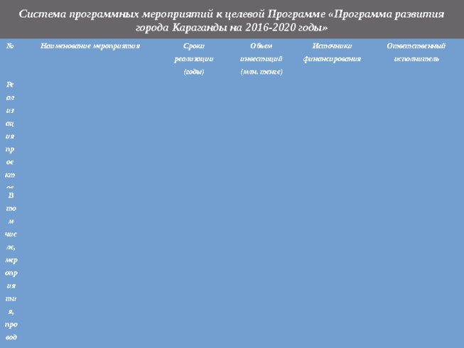 Система программных мероприятий к целевой Программе «Программа развития города Караганды на 2016-2020 годы» № Наименование мероприятия Сроки реализации (годы) Объем инвестиций (млн. тенге) Источники финансирования Ответственный исполнитель Реализация проектов и мероприятий в горнодобывающей отрасли 1 Проведение вскрышных работ для добычи угля открытым способом 2016-2020 - собственные и заемные средства ТОО «Батыр» 2 Введение в эксплуатацию новой линии электропередач 35к В 2016 год 65 собственные и заемные средства АО «Дорстройматериалы» 3 Модернизация производственных мощностей 2016-2020 28,5 собственные и заемные средства ТОО «Караганданерунд» Всего: 93,5 Реализация проектов и мероприятий в обрабатывающей отрасли В том числе, мероприятия, проводимые в производстве готовых металлических изделий, кроме машин и оборудования: 1 Модернизация линии радиаторов и строительство линий электропередач 2016 293,8 собственные и заемные средства ТОО «Сантехпром» 2 Приобретение оборудования для действующих производств и для транспортных средств 2017-2020 340 собственные и заемные средства ТОО «Сантехпром» Всего: 633,8 В том числе, мероприятия, проводимые в деревообрабатывающей отрасли: 1 Организация производства по переработке макулатуры и производство целлюлозы 2013-2016 900 собственные и заемные средства ТОО «Карагандинский целлюлозно-бумажный комбинат» 2 Организация производства туалетной бумаги и салфеток 2017 100 собственные и заемные средства ТОО «Вершина 2к» Всего: 1000