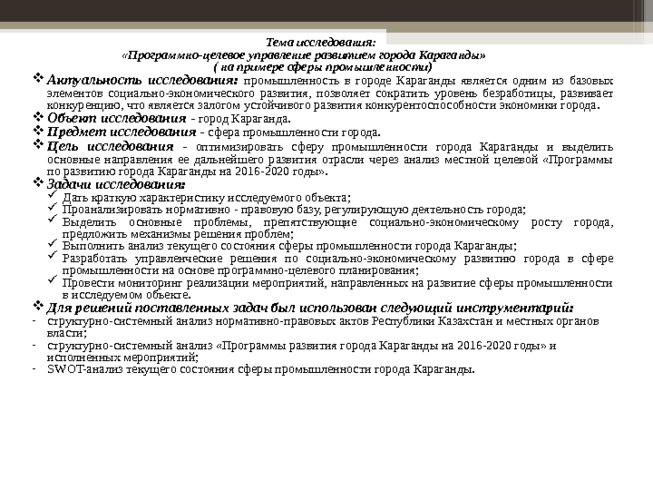 Тема исследования: «Программно-целевое управление развитием города Караганды»