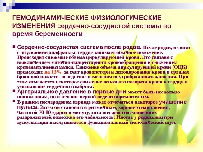 ГЕМОДИНАМИЧЕСКИЕ ФИЗИОЛОГИЧЕСКИЕ ИЗМЕНЕНИЯ сердечно-сосудистой системы во время беременности Сердечно-сосудистая система после родов. После родов, в связи с опусканием диафрагмы, сердце занимает обычное положение. Происходит снижение объема циркулирующей крови. Это связано с выключением маточно-плацентарного кровообращения и снижением кровенаполнения матки. Снижение объема циркулирующей крови (ОЦК) происходит на 13% за счет кровопотери и депонирования крови в органах брюшной полости вследствие изменения внутрибрюшного давления. При этом отмечается некоторое снижение венозного возврата крови к сердцу и уменьшение сердечного выброса. Артериальное давление в первые дни может быть несколько пониженным, но в течение первой недели нормализуется. В раннем послеродовом периоде может отмечаться некоторое учащение пульса. Затем он становится ритмичным, хорошего наполнения, частотой 70-80 ударов в минуту, хотя под действием внешних раздражителей возможна его лабильность. Иногда у родильниц при аускультации выслушивается функциональный систолический шум.