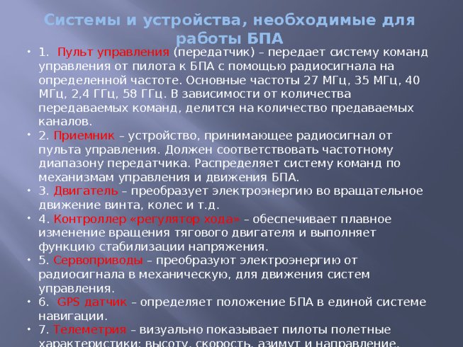 Системы и устройства, необходимые для работы БПА 1. Пульт управления (передатчик) – передает систему команд управления от пилота к БПА с помощью радиосигнала на определенной частоте. Основные частоты 27 МГц, 35 МГц, 40 МГц, 2,4 ГГц, 58 ГГц. В зависимости от количества передаваемых команд, делится на количество предаваемых каналов. 2. Приемник – устройство, принимающее радиосигнал от пульта управления. Должен соответствовать частотному диапазону передатчика. Распределяет систему команд по механизмам управления и движения БПА. 3. Двигатель – преобразует электроэнергию во вращательное движение винта, колес и т.д. 4. Контроллер «регулятор хода» – обеспечивает плавное изменение вращения тягового двигателя и выполняет функцию стабилизации напряжения. 5. Сервоприводы – преобразуют электроэнергию от радиосигнала в механическую, для движения систем управления. 6. GPS датчик – определяет положение БПА в единой системе навигации. 7. Телеметрия – визуально показывает пилоты полетные характеристики: высоту, скорость, азимут и направление, напряжение бортового аккумулятора и аккумулятора передатчика. 8. Силовой или бортовой аккумулятор