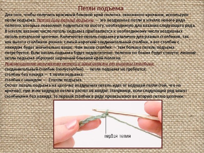 Для того, чтобы получить красивый боковой край полотна, связанного крючком, используют петли подъема. Петля (или петли) подъема — это воздушные петли в начале нового ряда полотна, которые позволяют подняться на высоту, необходимую для вязания следующего ряда. В начале вязания число петель подъема прибавляется к необходимому числу воздушных петель начальной цепочки. Количество петель подъема различно для разных столбиков, так как высота столбиков разная: самый короткий соединительный столбик, а вот столбик с накидом будет значительно выше. Чем выше столбик — тем больше петель подъема потребуется. Если петель подъема будет недостаточно, полотно по бокам будет стянуто; лишние петли подъема образуют неровный боковой край полотна. Рекомендуемое количество петель в зависимости от высоты столбика: соединительный столбик (полустолбик) — петля подъема не требуется; столбик без накида — 1 петля подъема; столбик с накидом — 2 петли подъема. Отсчет петель подъема на цепочке воздушных петель идет от ведущей петли (той, что на крючке), при этом ведущая петля в расчет не входит. Например, если следующий ряд вяжут столбиками без накида, то первый столбик в ряду провязывают во вторую петлю цепочки: Петли подъема