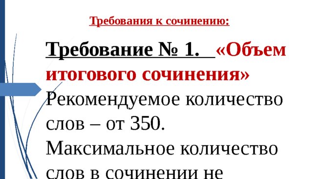 Требования к сочинению: Требование № 1. «Объем итогового сочинения» Рекомендуемое количество слов – от 350. Максимальное количество слов в сочинении не устанавливается. Если в сочинении менее 250 слов (в подсчёт включаются все слова, в том числе и служебные), то выставляется « незаче т» за невыполнение требования № 1 и «незачет» за работу в целом (такое сочинение не проверяется по критериям оценивания). Требование № 2. «Самостоятельность написания итогового сочинения» Итоговое сочинение выполняется самостоятельно. Не допускается списывание сочинения (фрагментов сочинения) из какого-либо источника или воспроизведение по памяти чужого текста (работа другого участника, текст, опубликованный в бумажном и (или) электронном виде, и др.). Допускается прямое или косвенное цитирование с обязательной ссылкой на источник (ссылка дается в свободной форме). Объем цитирования не должен превышать объем собственного текста участника . Если сочинение признано несамостоятельным, то выставляется «незачет» за невыполнение требования № 2 и «незачет» за работу в целом (такое сочинение не проверяется по критериям оценивания).