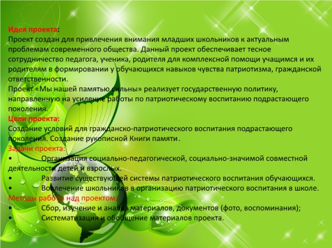 Проект создан для привлечения внимания младших школьников к актуальным проблемам современного общества. Данный проект обеспечивает тесное сотрудничество педагога, ученика, родителя для комплексной помощи учащимся и их родителям в формировании у обучающихся навыков чувства патриотизма, гражданской ответственности.