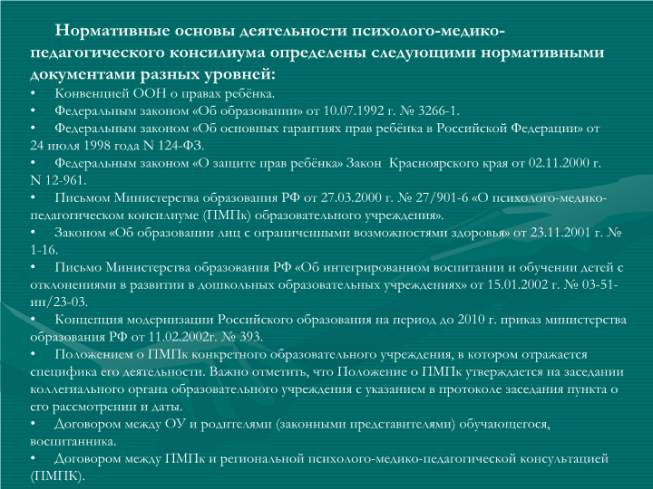 Нормативные основы деятельности психолого-медико-педагогического консилиума определены следующими нормативными документами разных уровней:
