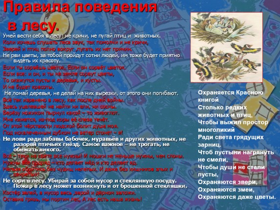 Ты гнёзда разорять не смей! Не трогай птичьих гнёзд!» Дети: Мы не будем разорять! Вот слово всех ребят. Пусть птичьи песенки опять В лесу у нас звенят.