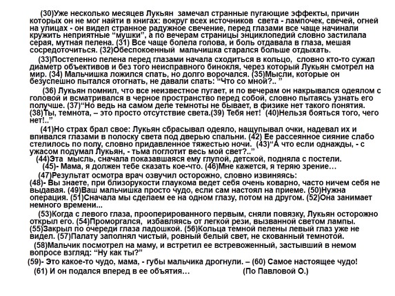 (30)Уже несколько месяцев Лукьян замечал странные пугающие эффекты, причин которых он не мог найти в книгах: вокруг всех источников света - лампочек, свечей, огней на улицах - он видел странное радужное свечение, перед глазами все чаще начинали кружить неприятные “мушки”, а по вечерам страницы энциклопедий словно застилала серая, мутная пелена. (31) Все чаще болела голова, и боль отдавала в глаза, мешая сосредоточиться. (32)Обеспокоенный мальчишка старался больше отдыхать.
